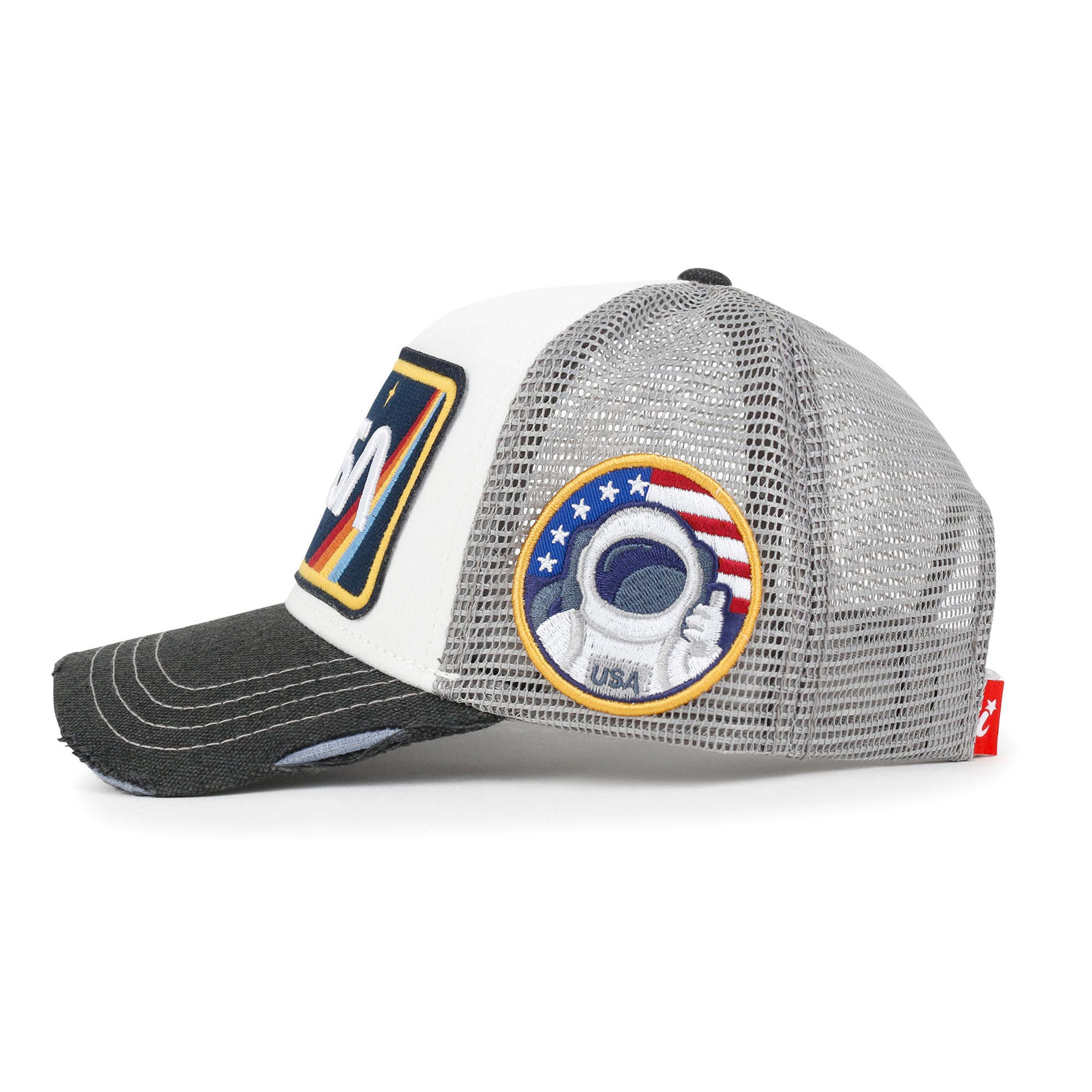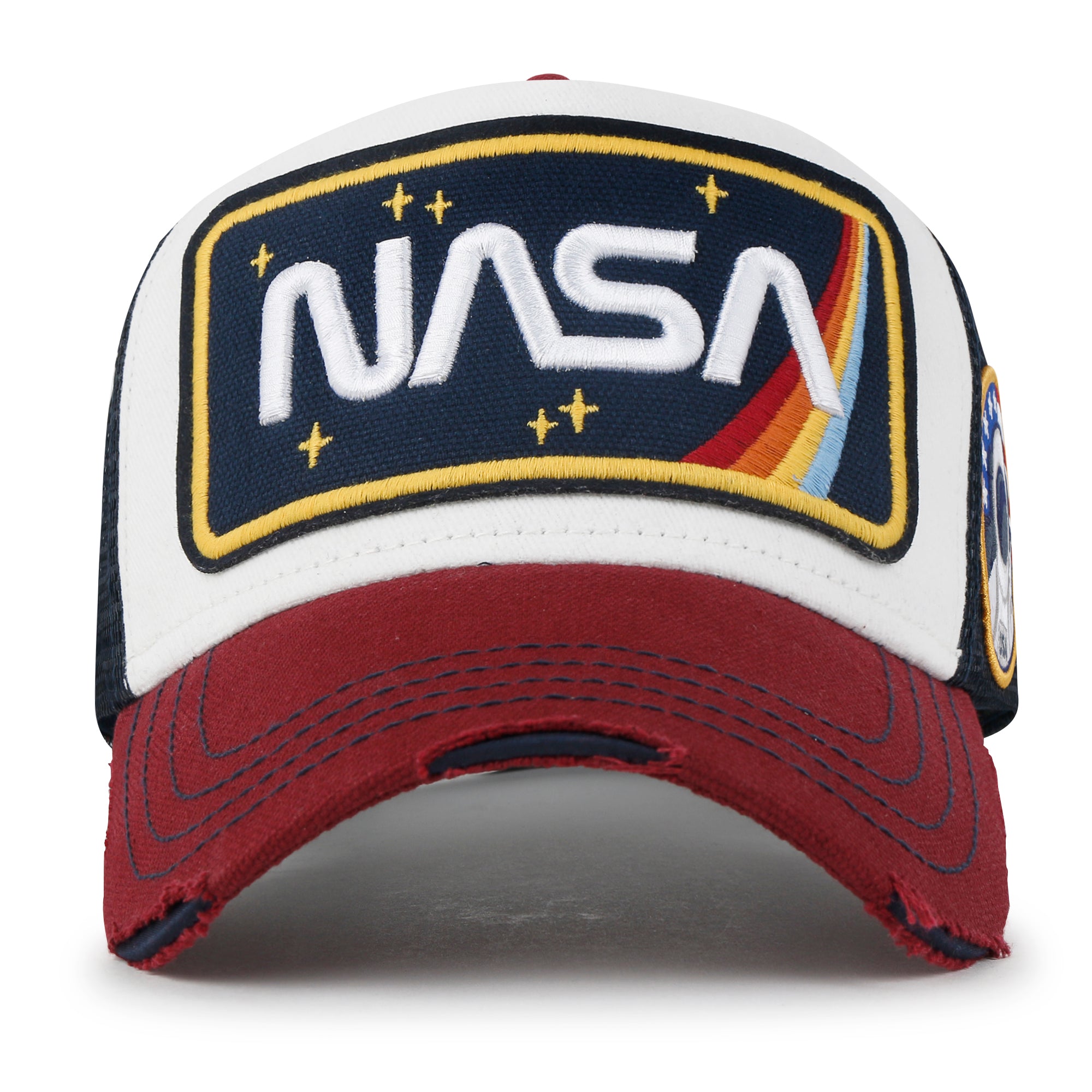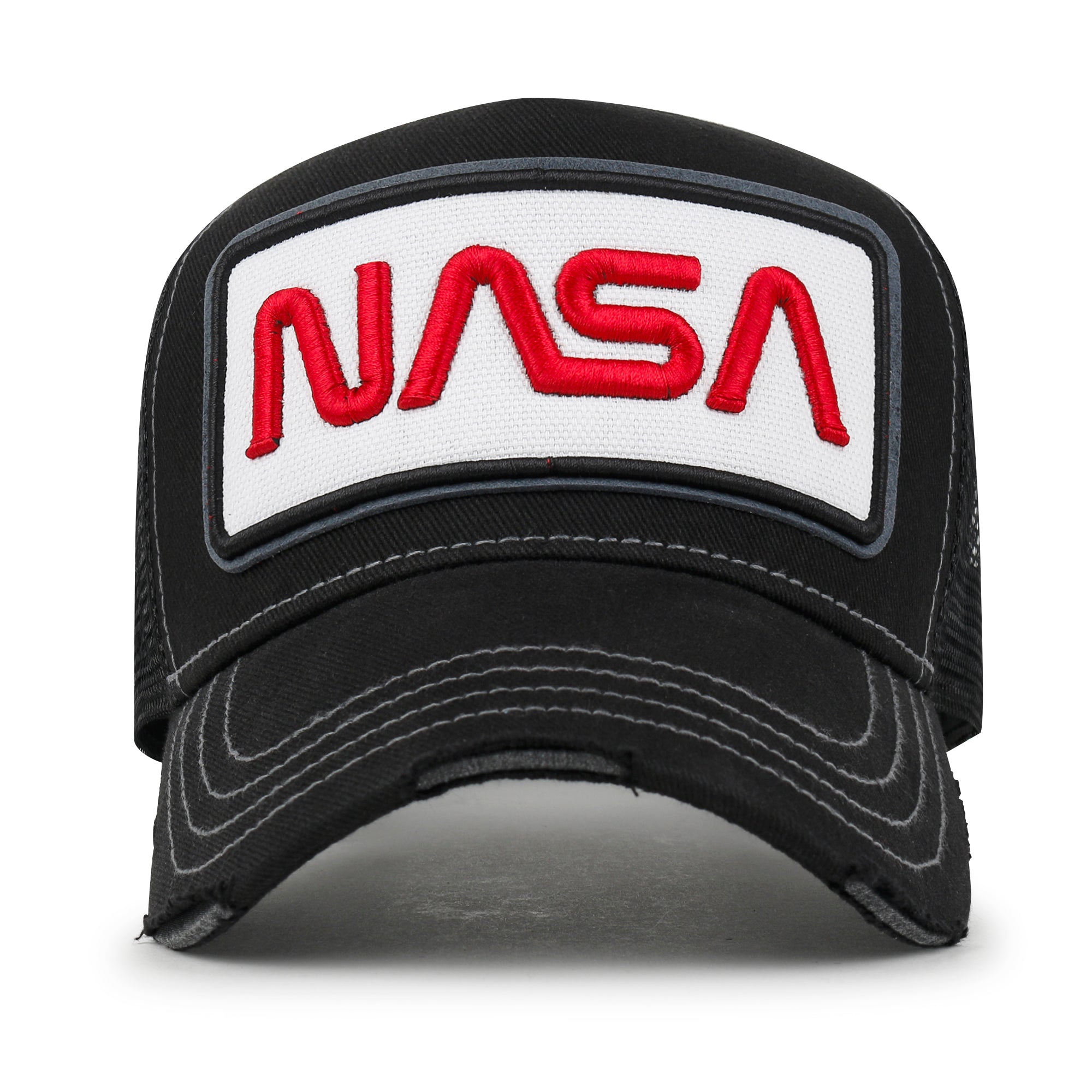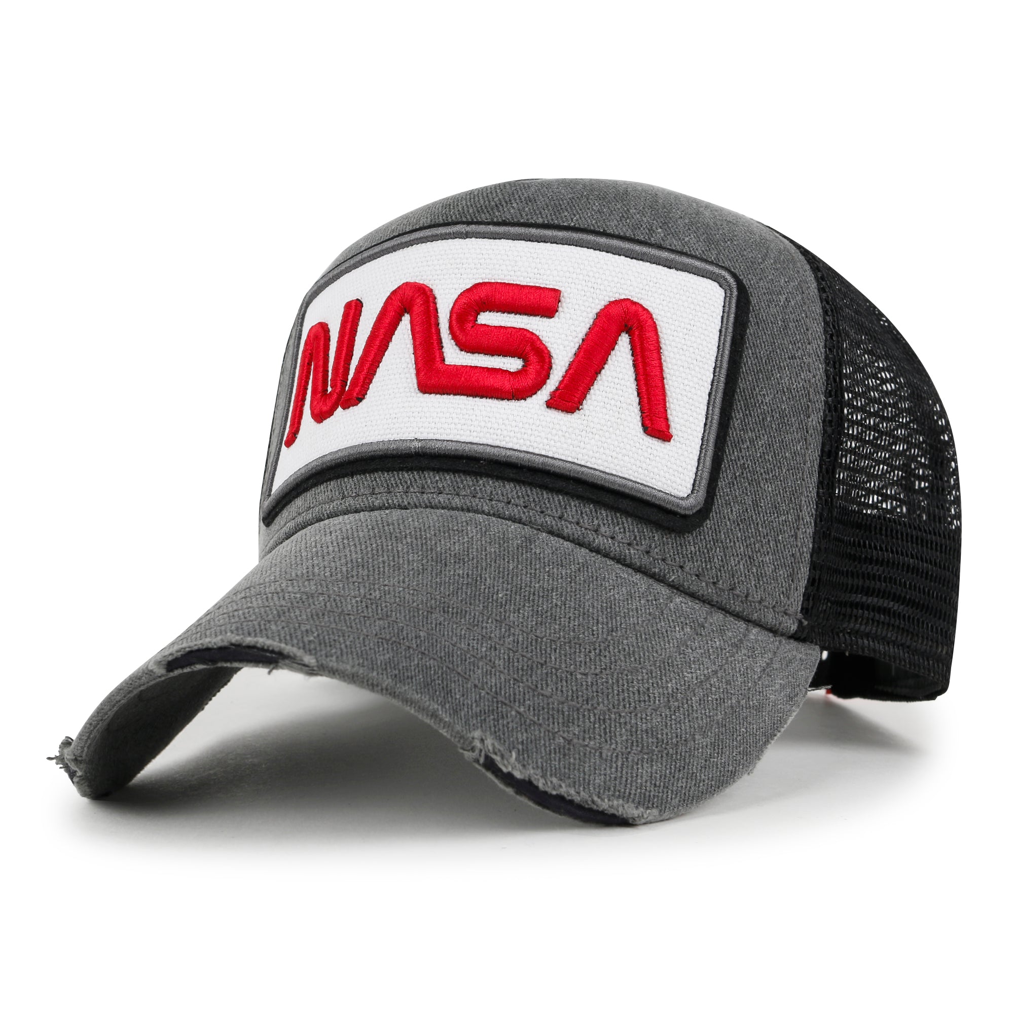 Trim/Embellishment: washed color distressed cotton baseball cap with NASA logo embroidered on the front. color blocked half mesh back trucker cap has adjustable snap back closure.