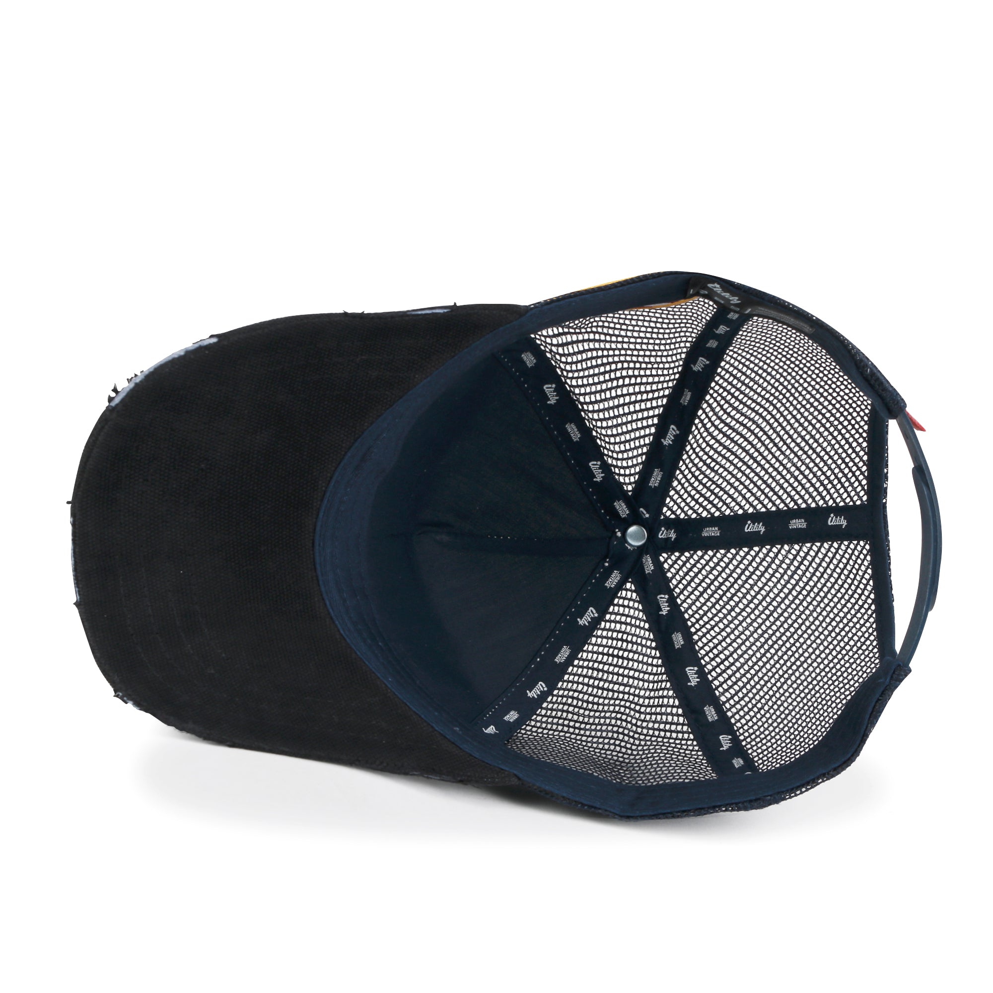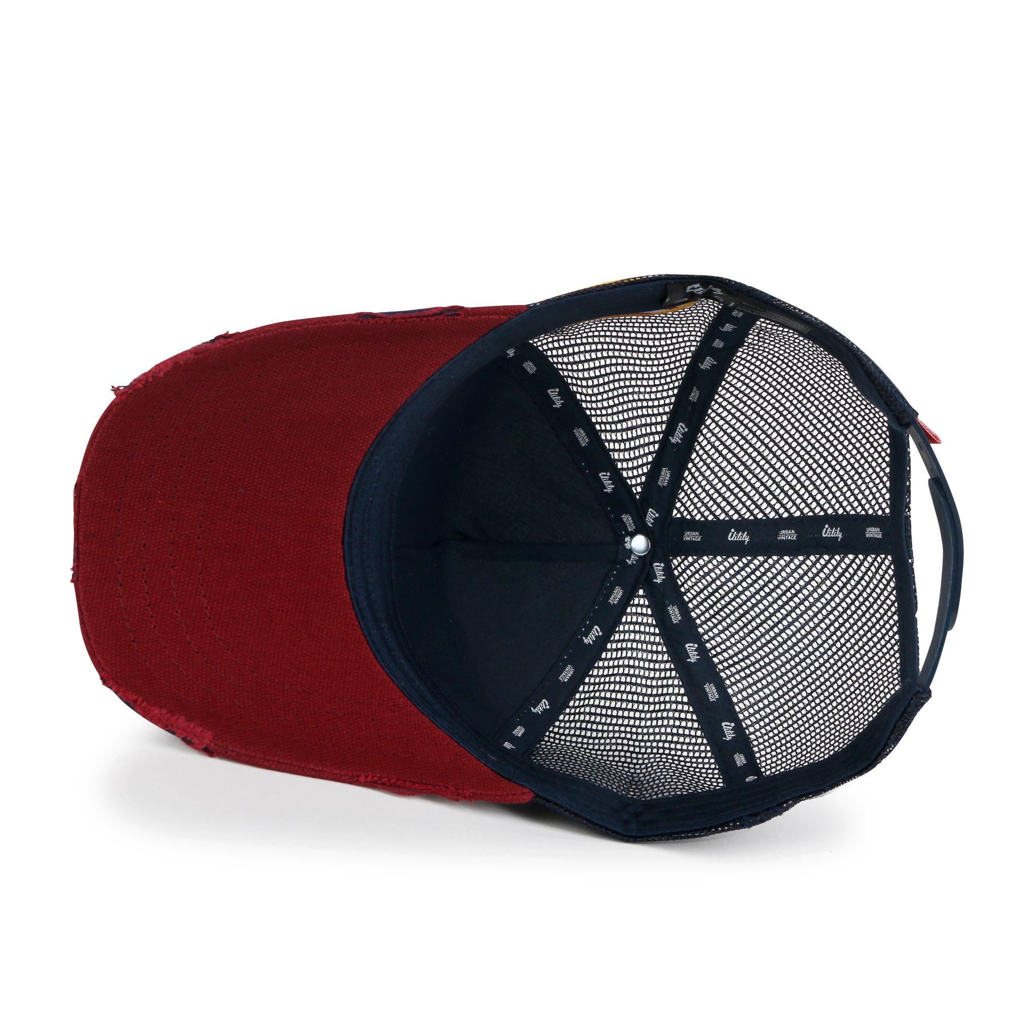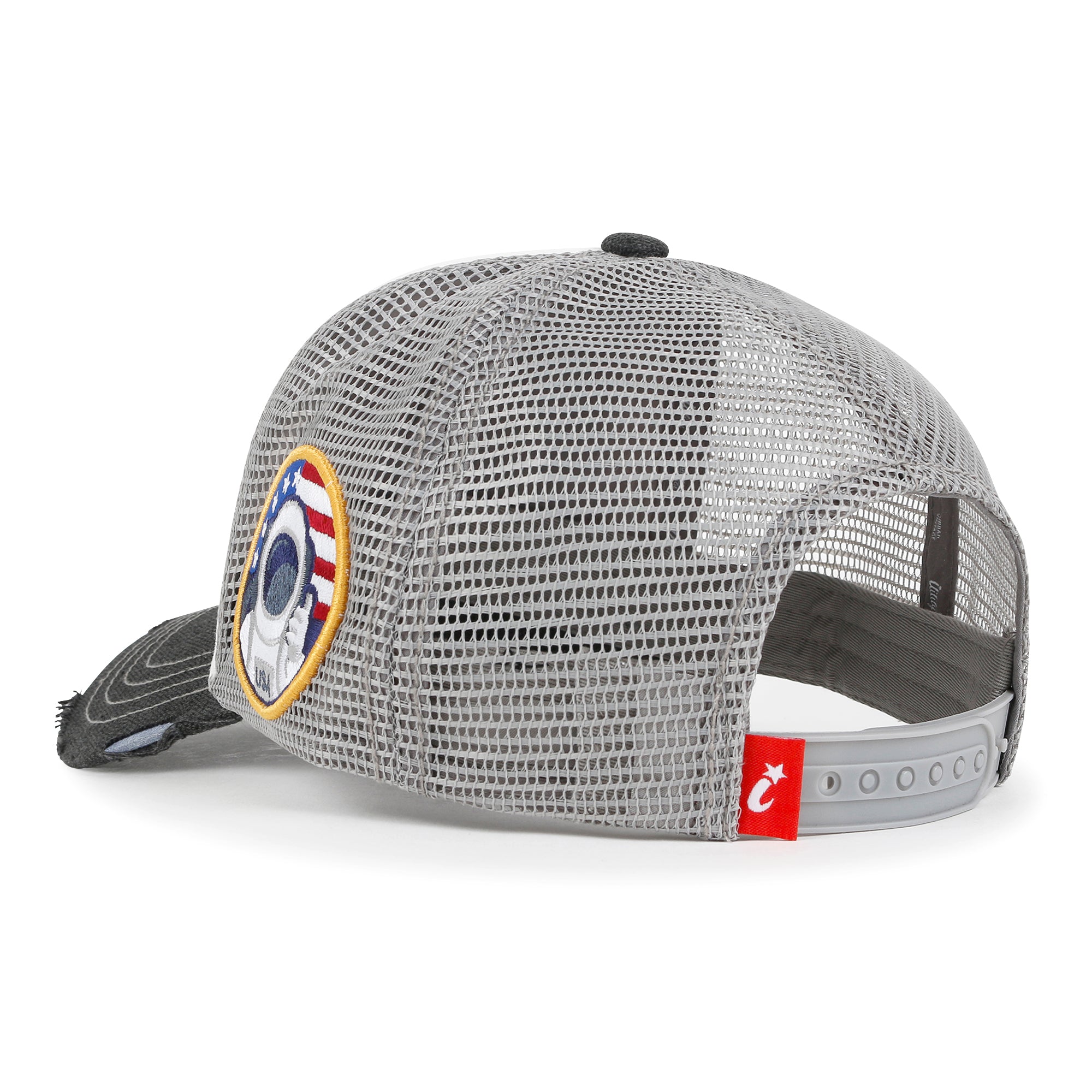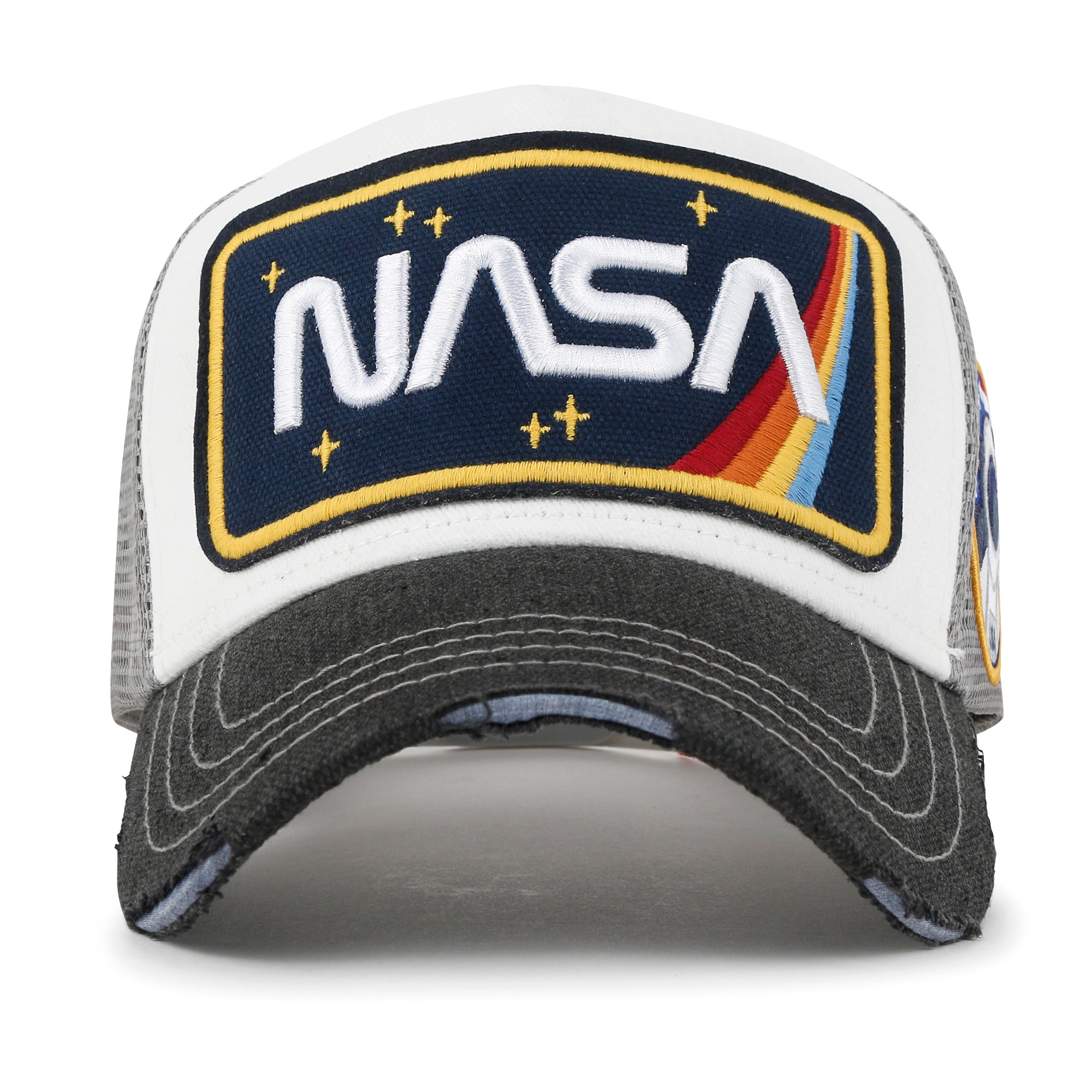Trim/Embellishment: washed color distressed cotton baseball cap with NASA logo embroidered on the front. color blocked half mesh back trucker cap has adjustable snap back closure.