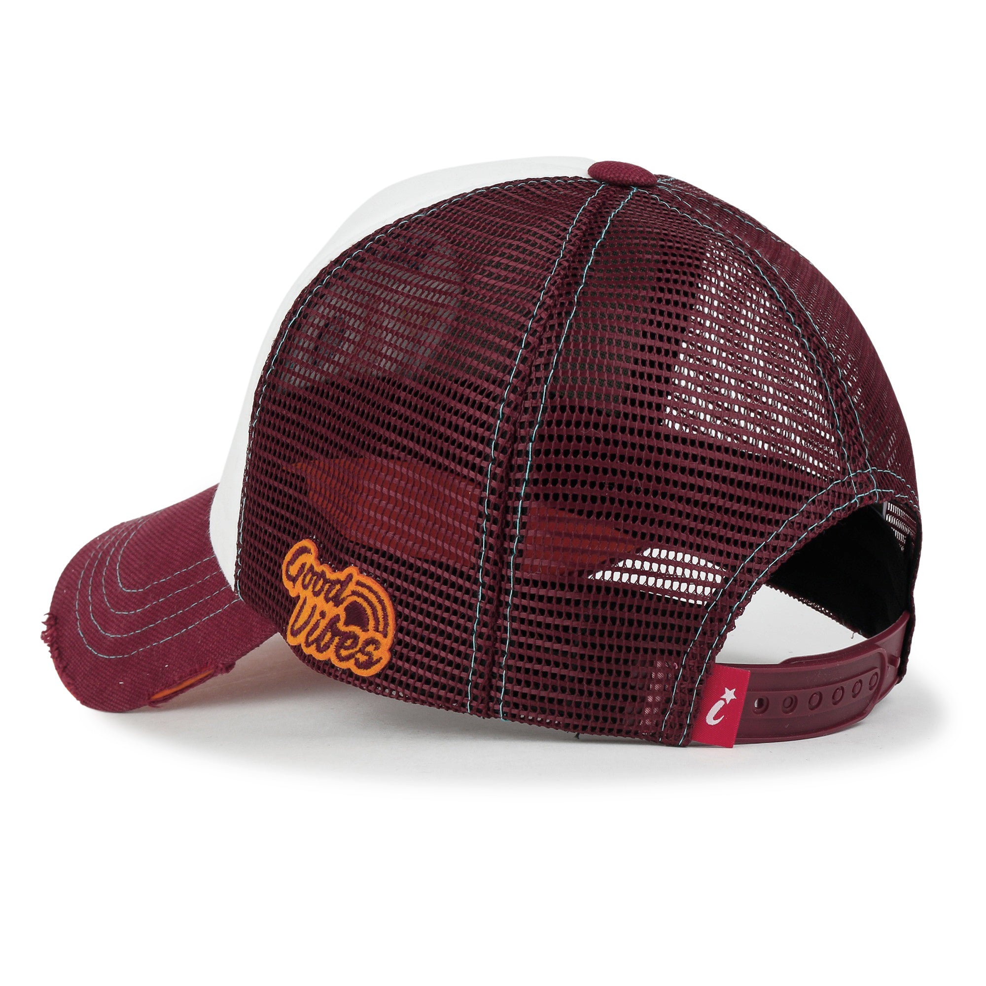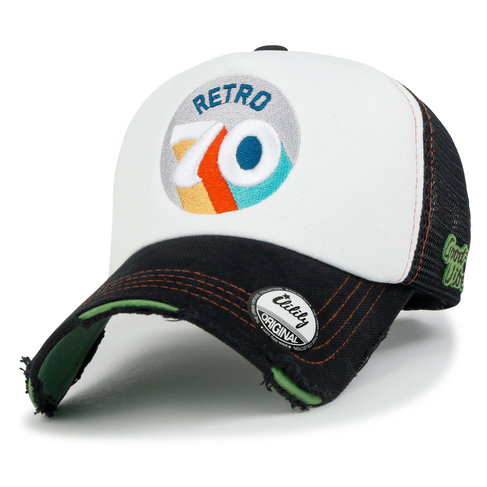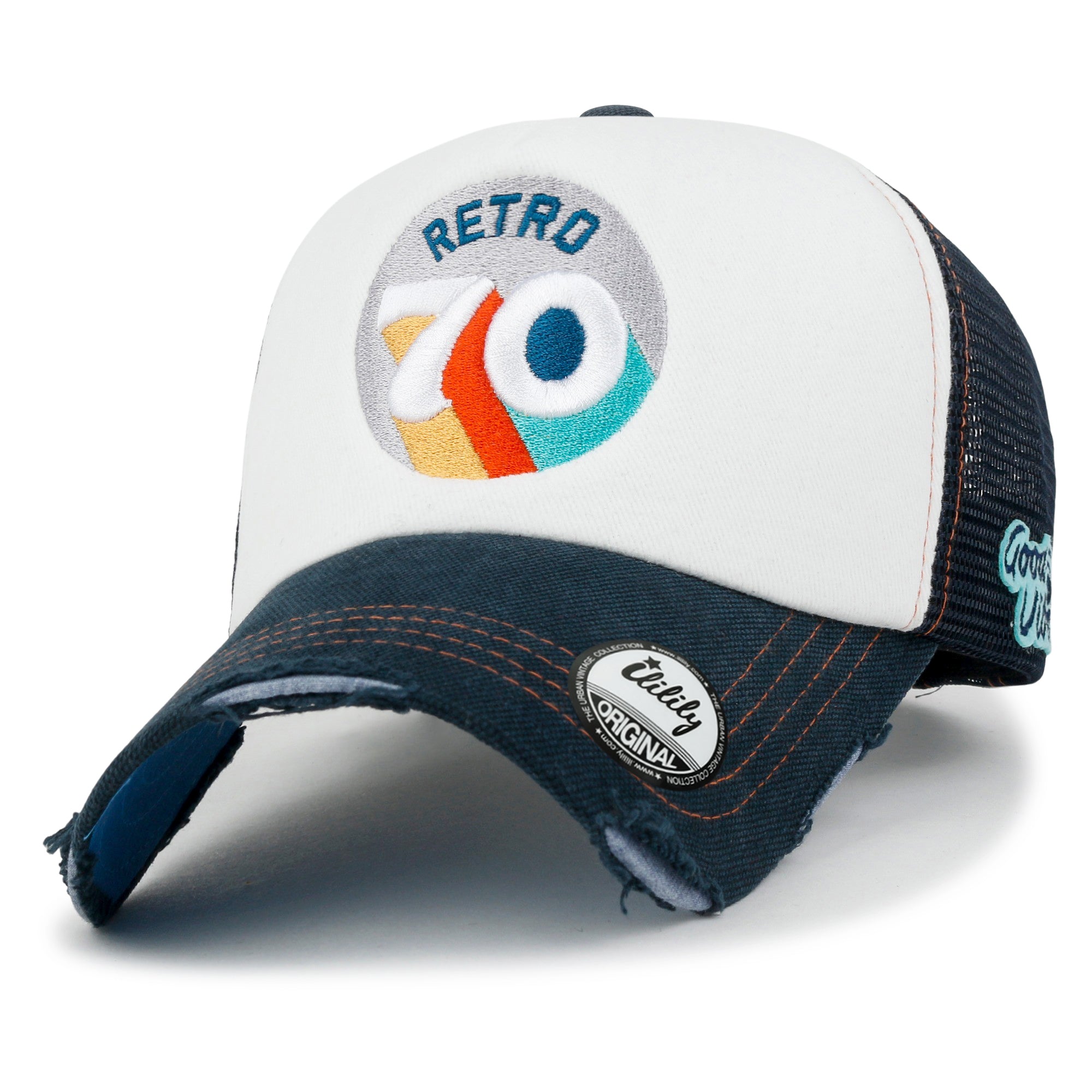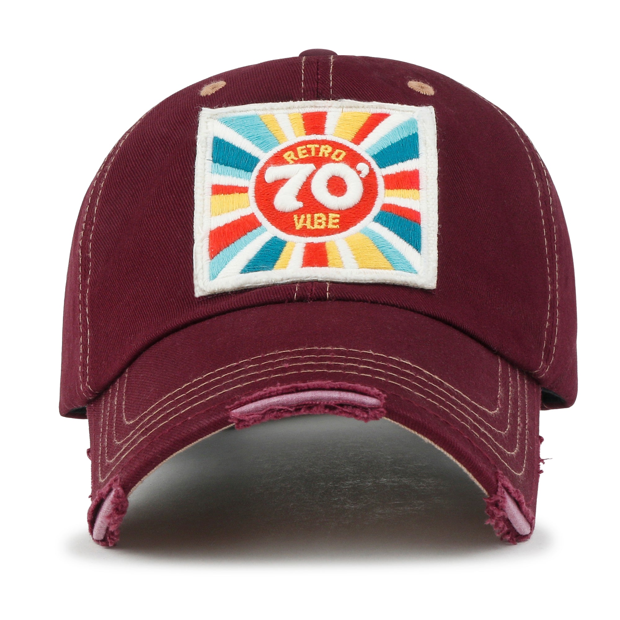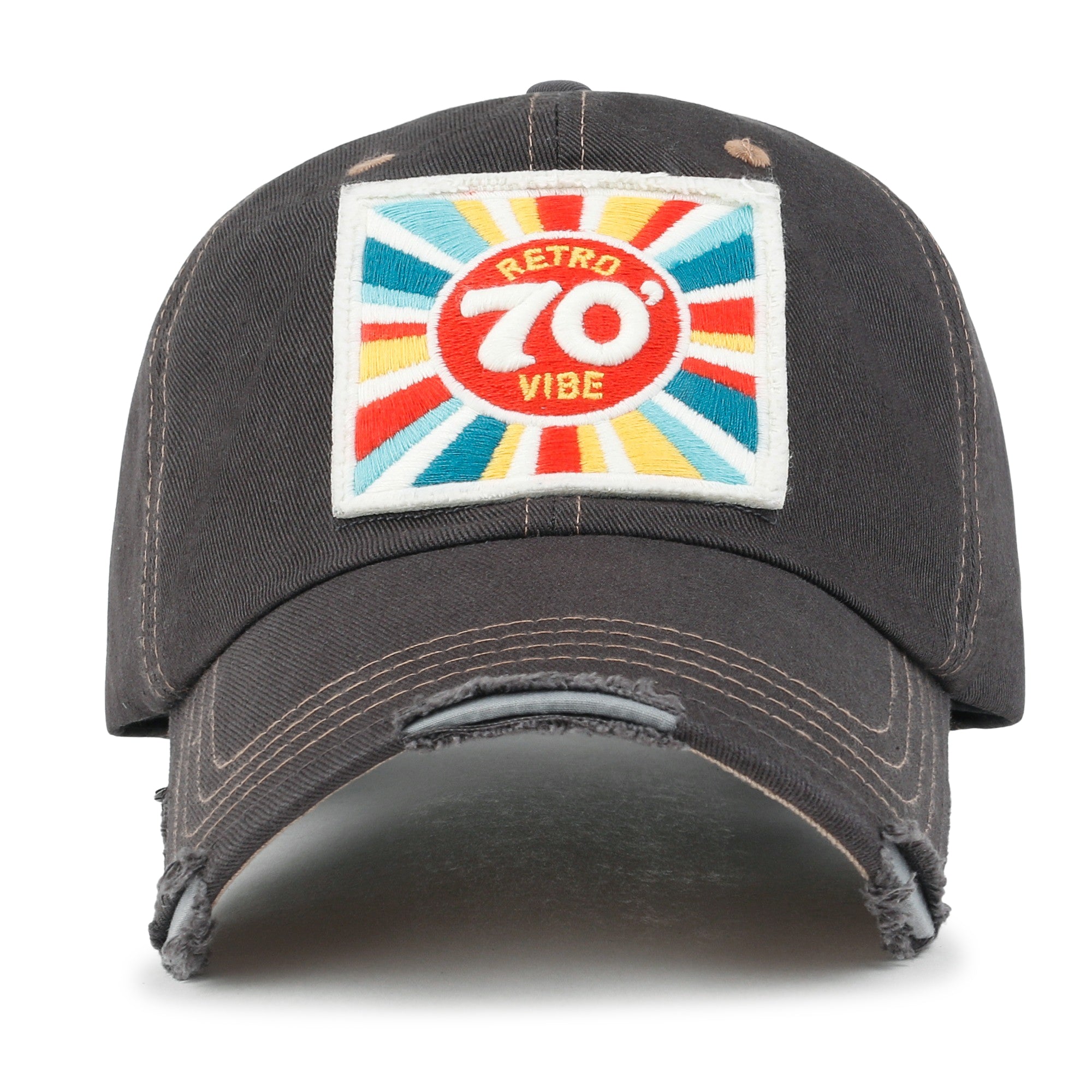 Trim/Embellishment: cotton baseball cap with colorful retro mood embroidered on front.