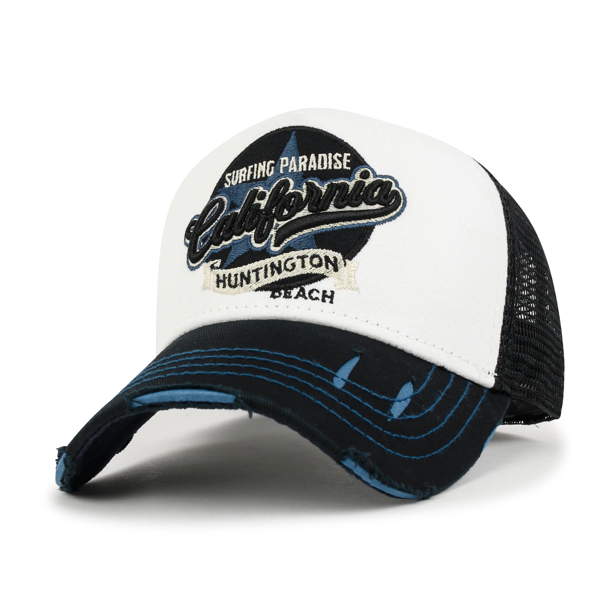 ililily Premium California Huntington Round Embroidery Hat Vintage Baseball Cap Style: premium distressed cotton baseball cap with snapback closure Trim: round embroidery patch on the front featuring california embroidery with a star and HUNTINGTON displayed on the tape Brim: distressed detail on brim. contrast color under brim Crown: well made structured round crown dad hat. inner of cap is lined with sweatband for optimal wearing comfort. Inner band medium: approx. 58cm (7 1/4) / brim width: approx. 7cm (2.75")