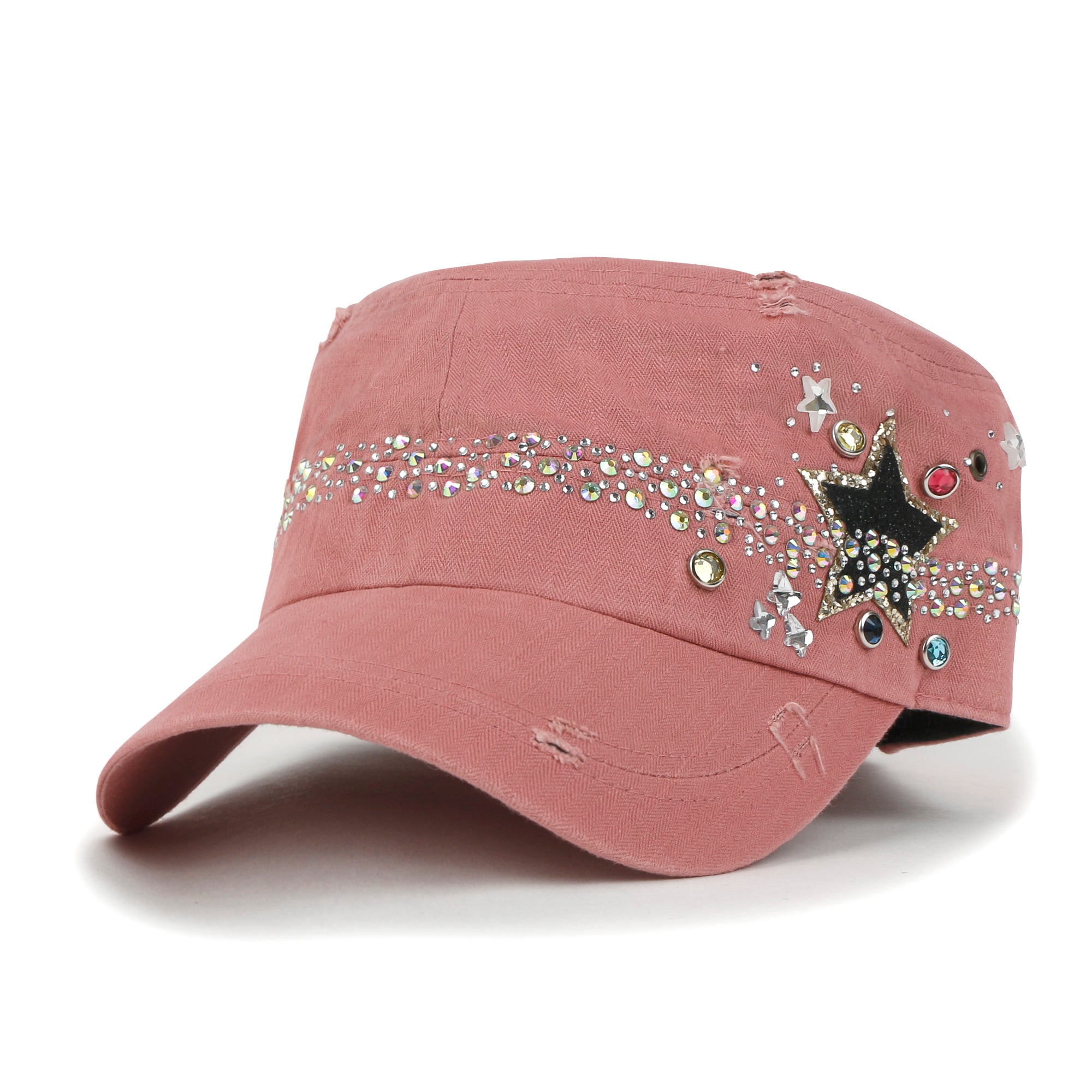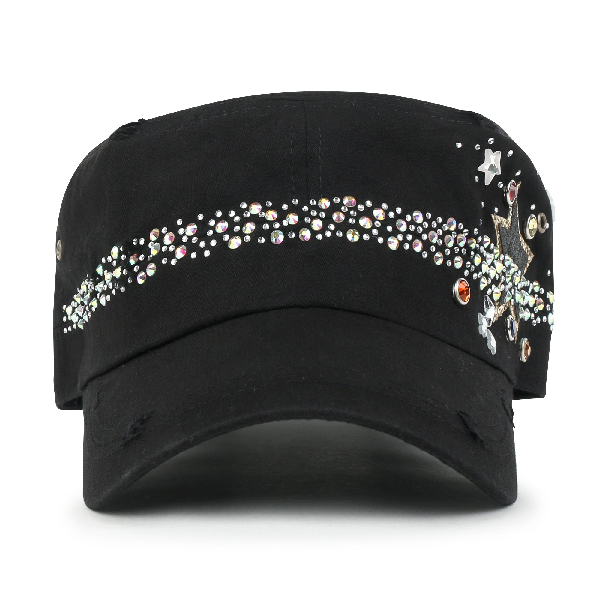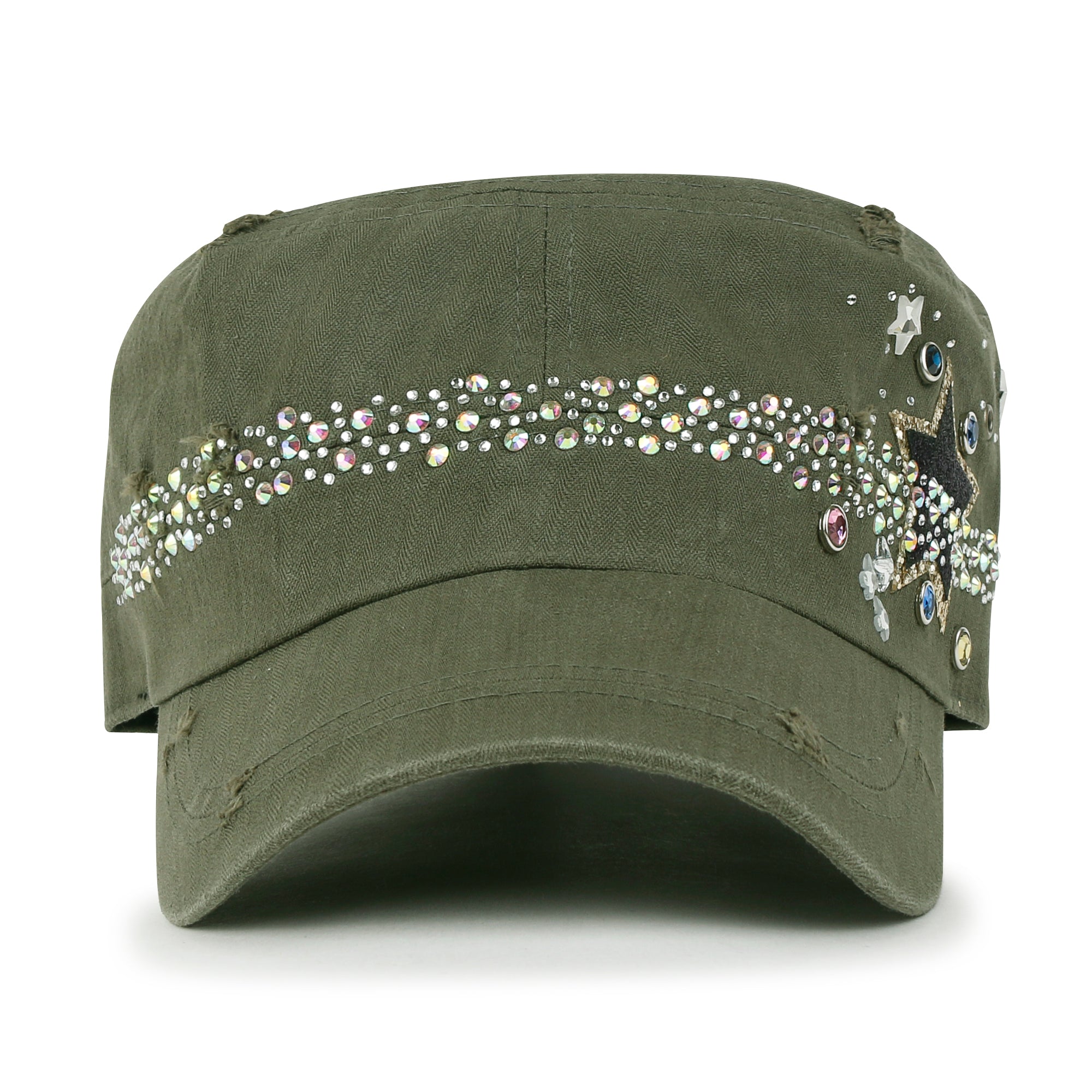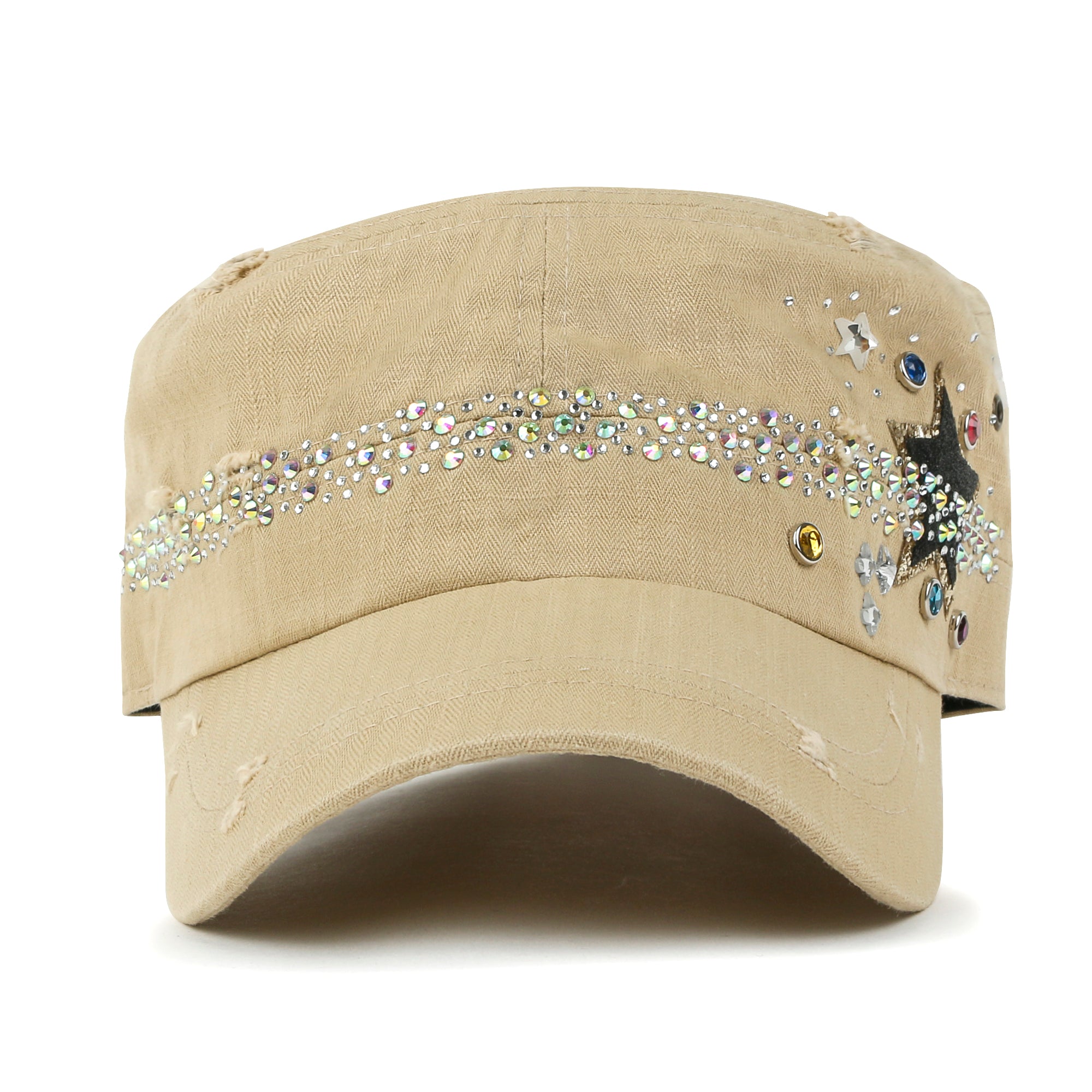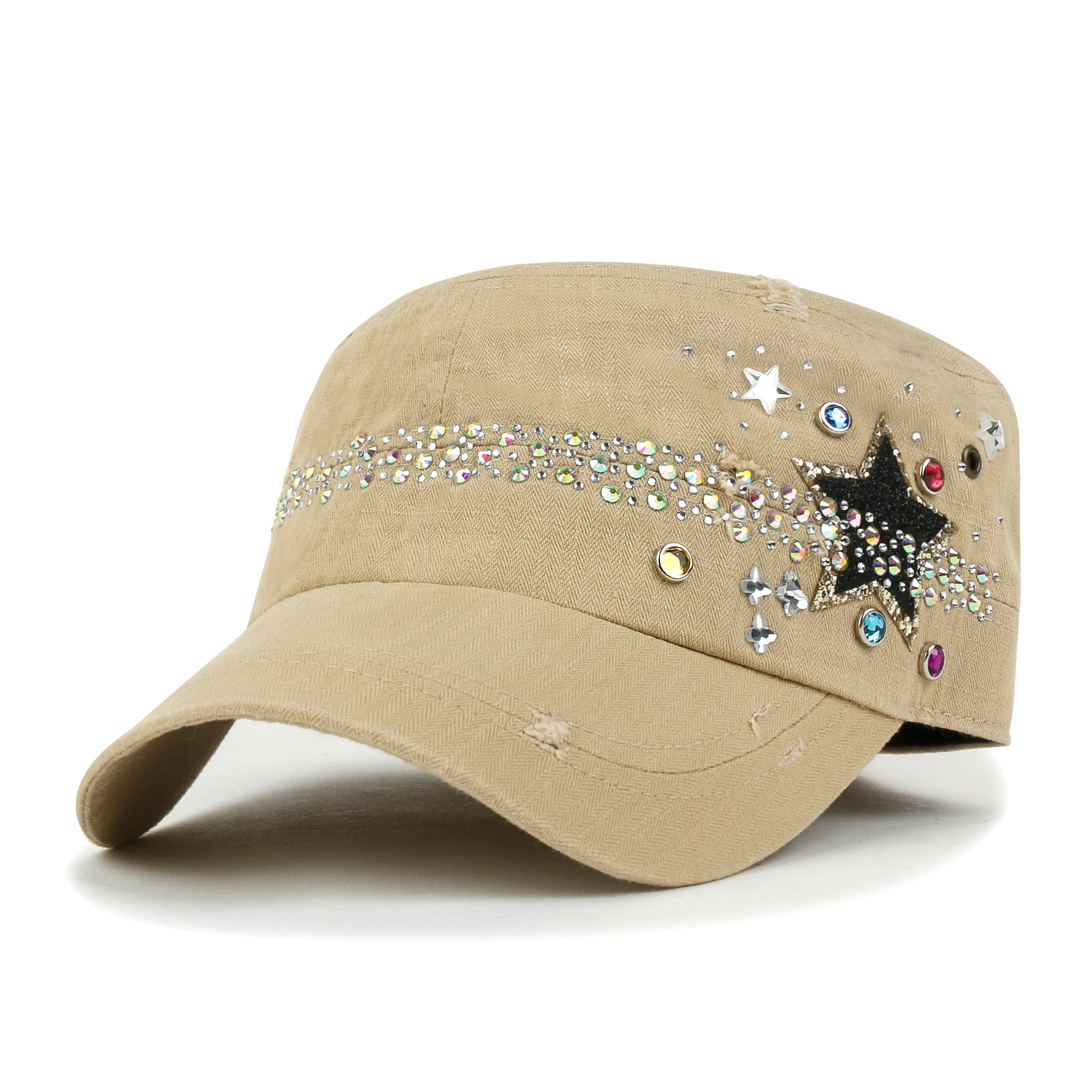 Trim/Embellishment: star spangled, rhinestone and stud detail military army cap