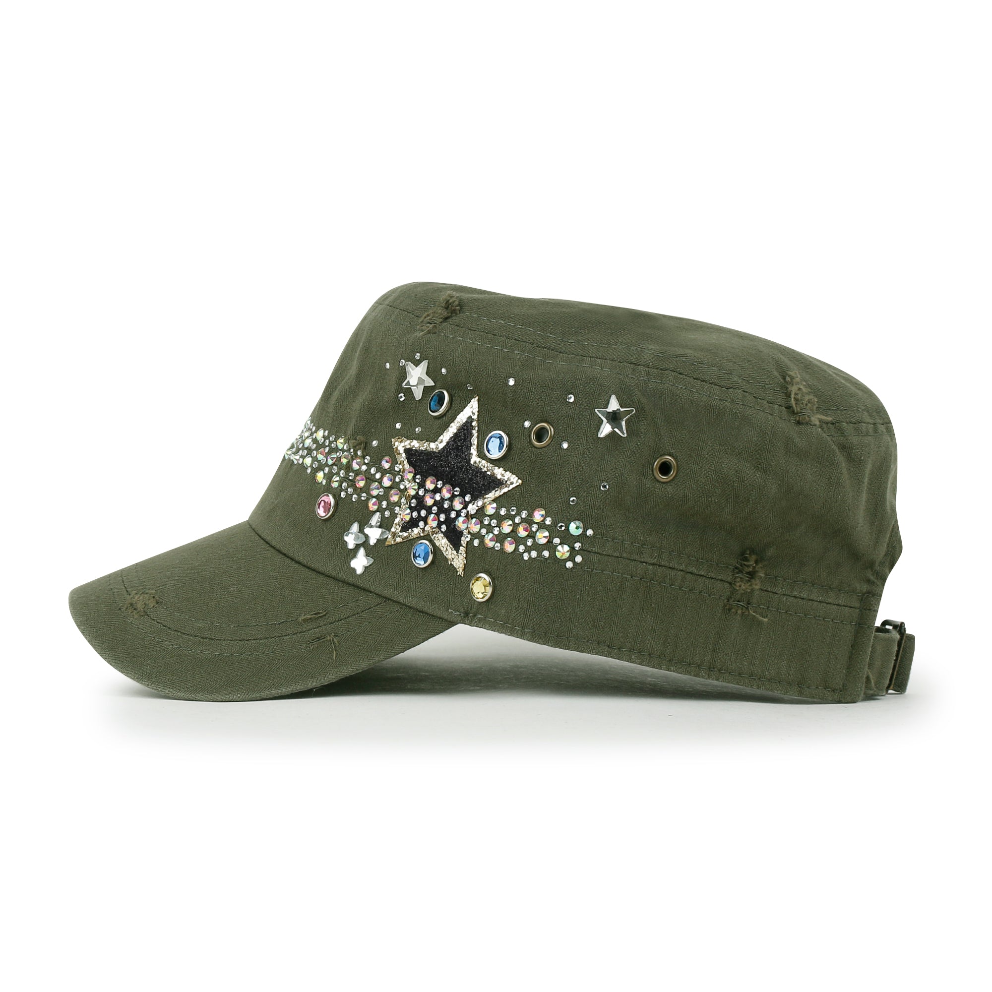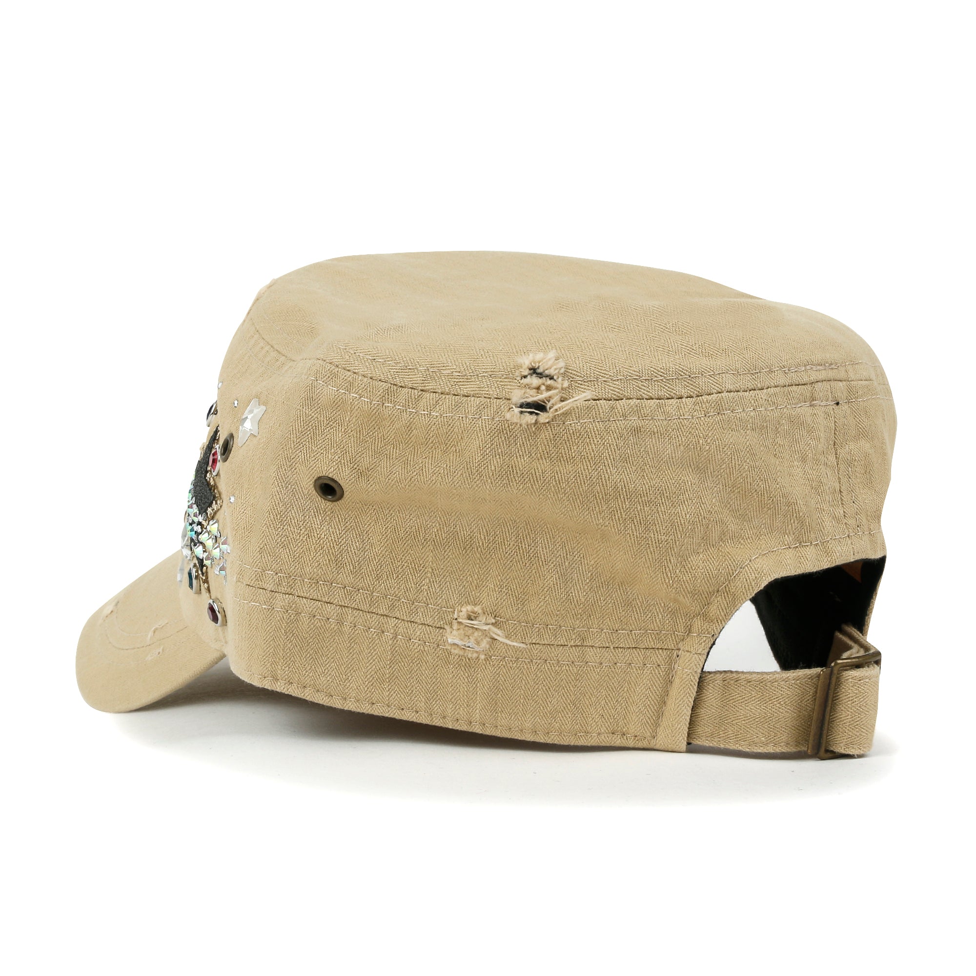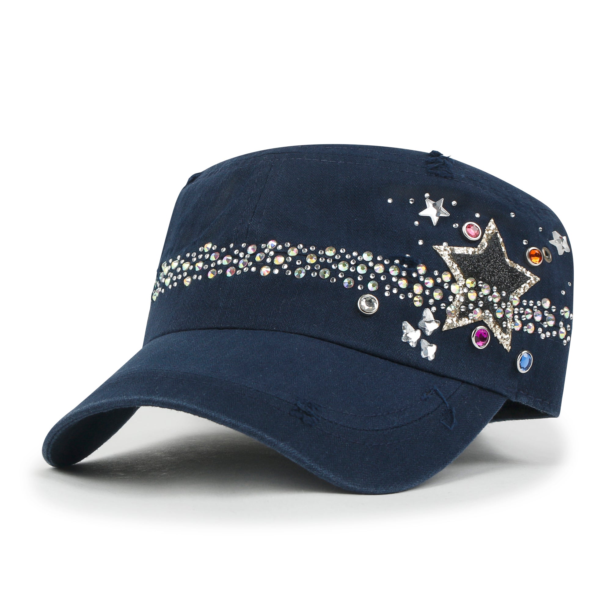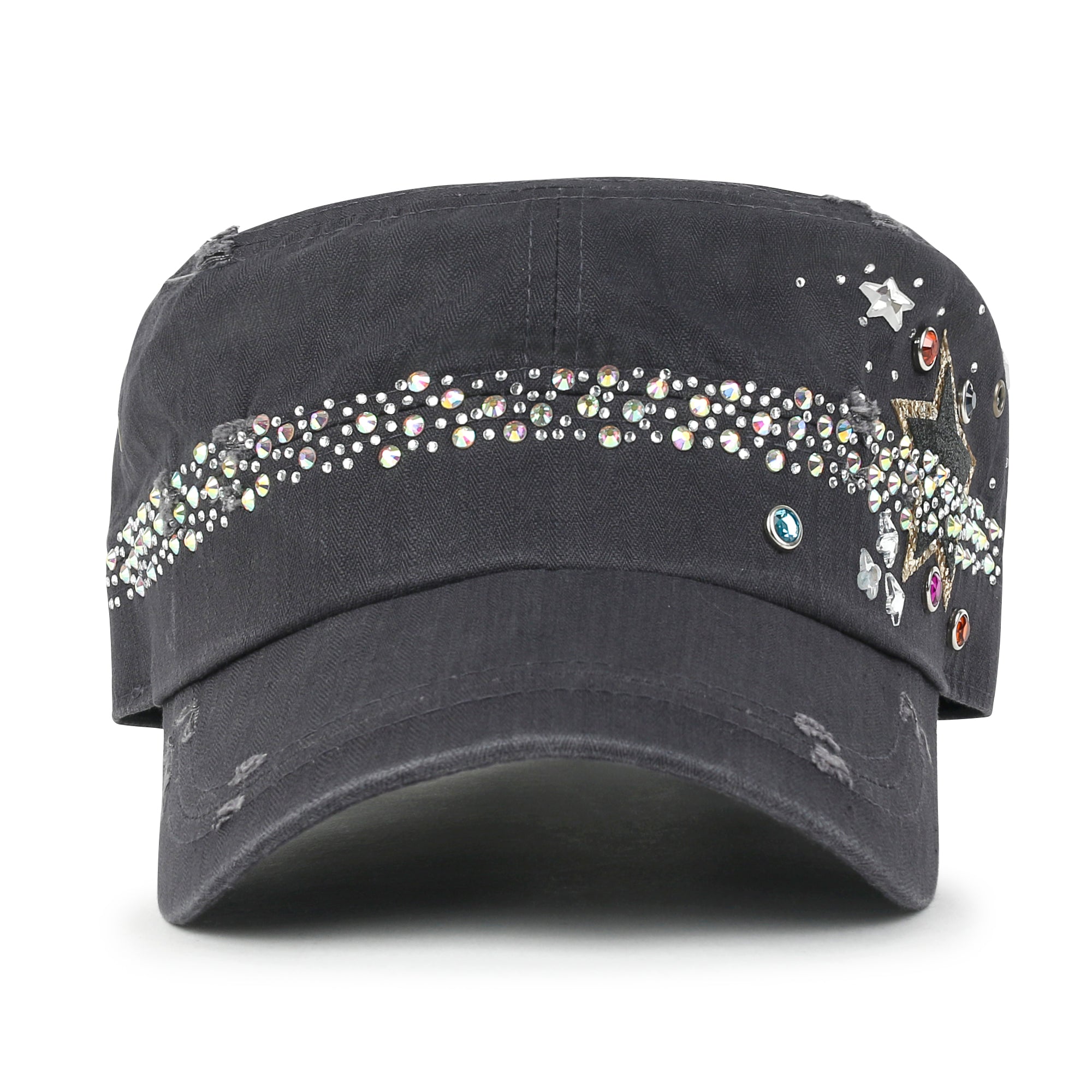 Trim/Embellishment: star spangled, rhinestone and stud detail military army cap