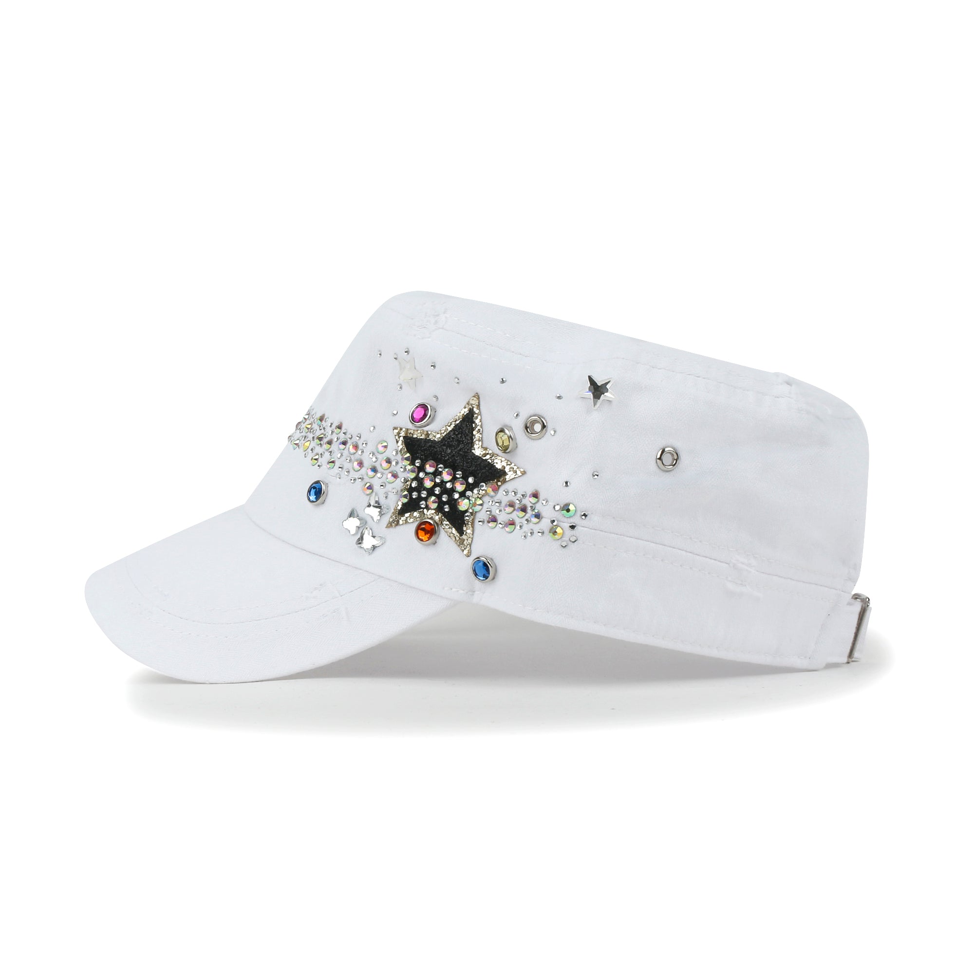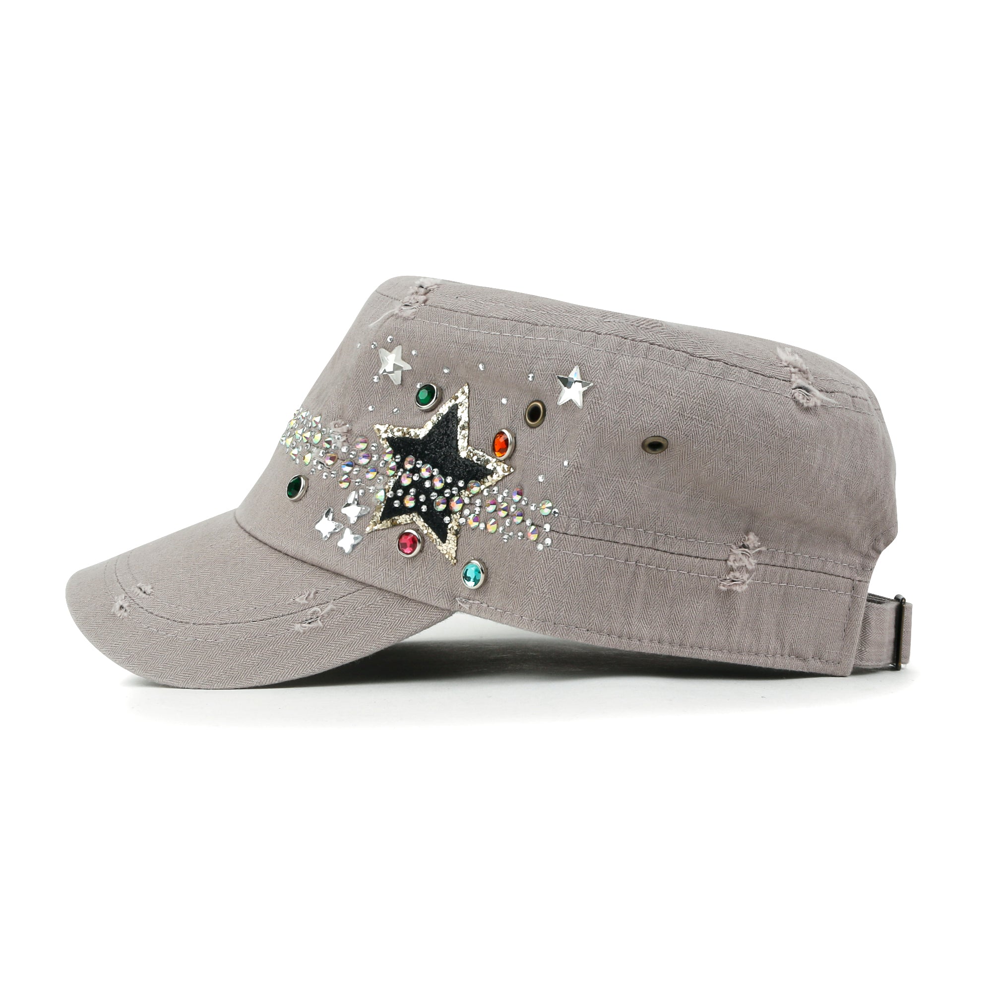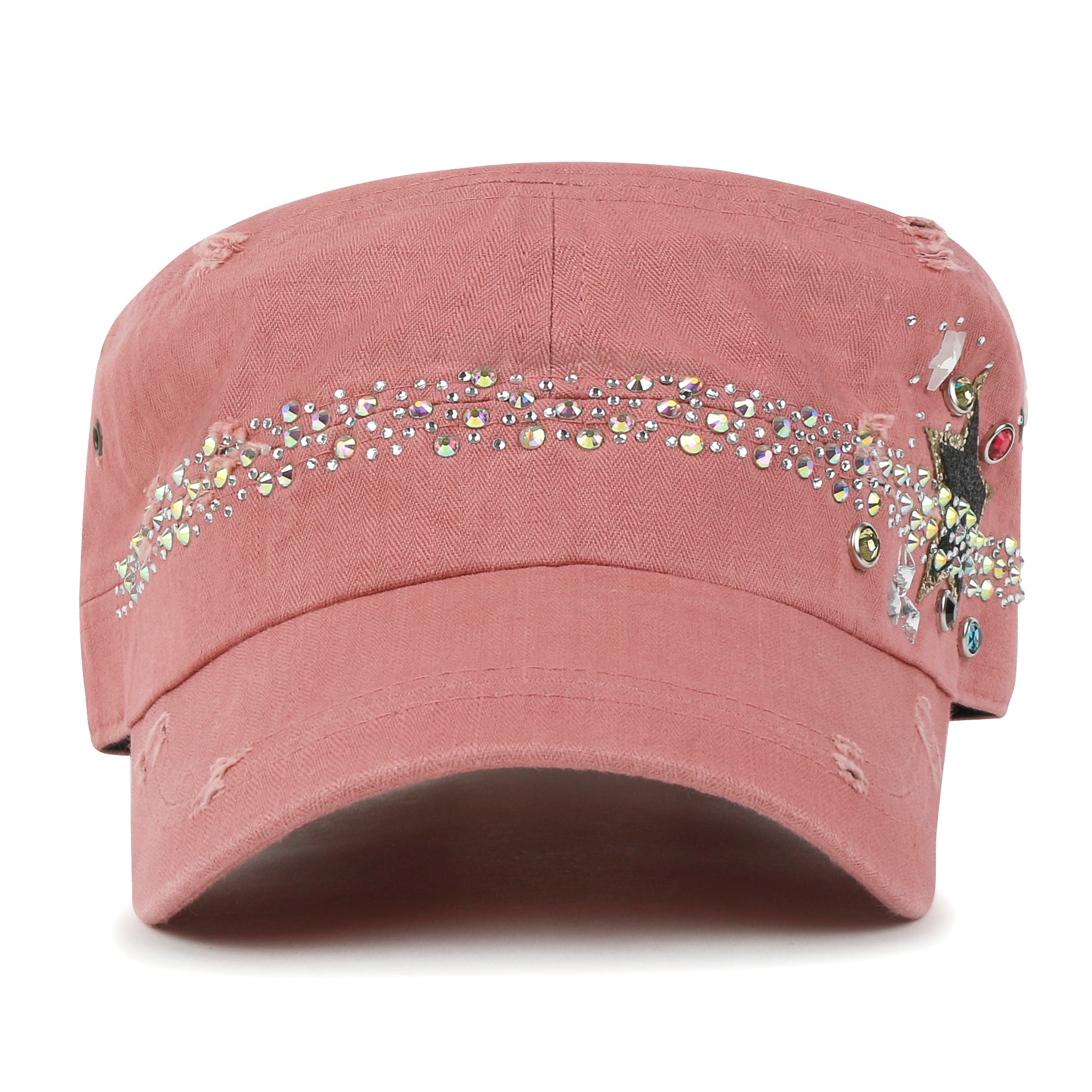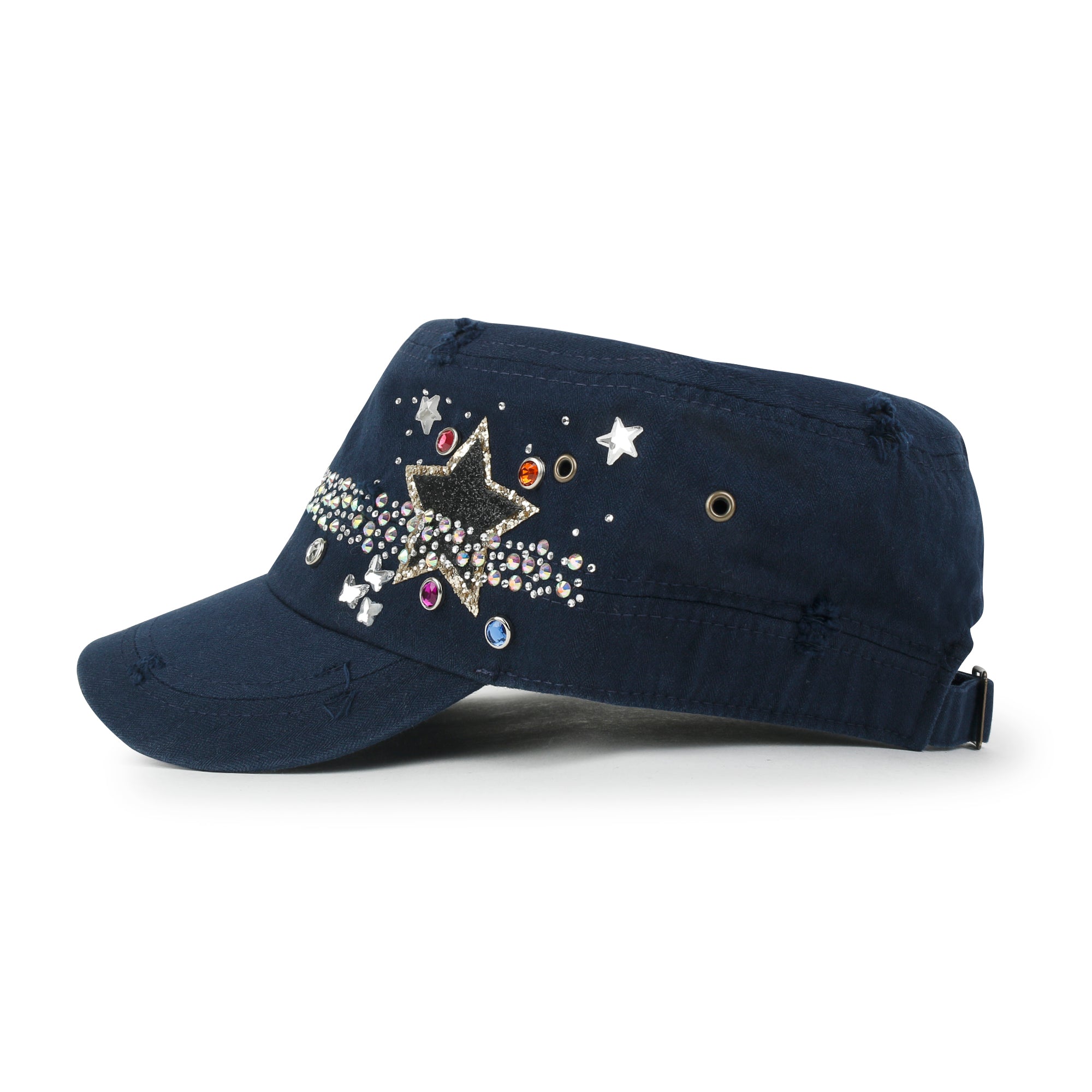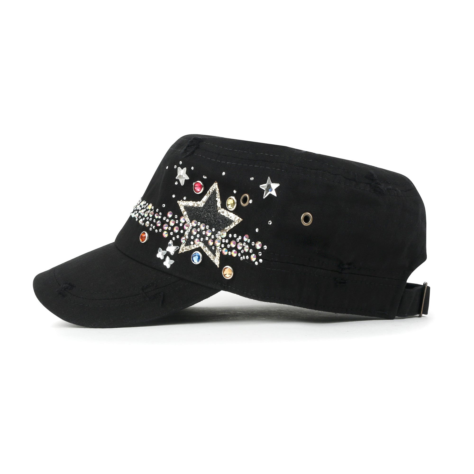 Trim/Embellishment: star spangled, rhinestone and stud detail military army cap